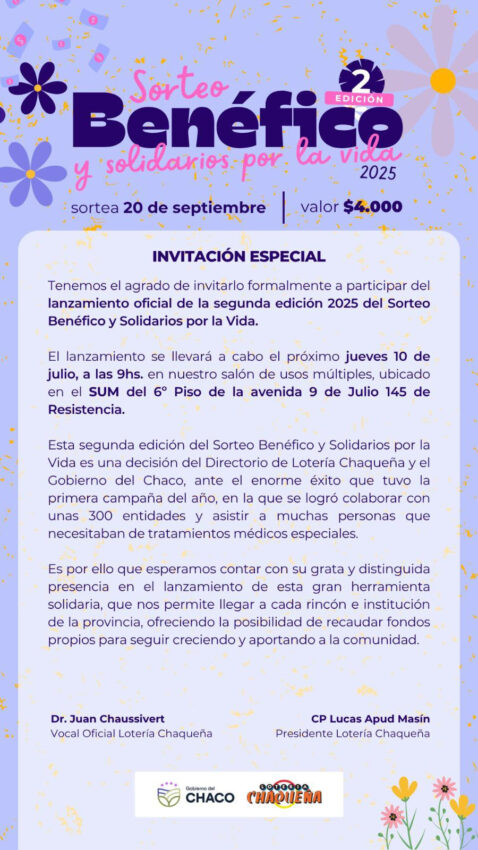 El Directorio de Lotería Chaqueña, a través de la Dirección de Juegos Especiales, anuncia oficialmente el lanzamiento de la segunda edición anual del Sorteo Benéfico y Solidarios por la Vida– Emisión Nº 086.
