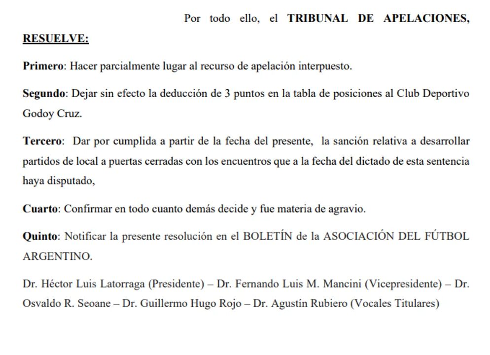 Además, se dejó sin efecto la determinación que indicaba que el equipo mendocino debía jugar a puertas cerradas durante seis encuentros, algo que solo sucedió en tres del Torneo Apertura ante Platense, San Lorenzo e Independiente Rivadavia en el clásico mendocino el pasado sábado.