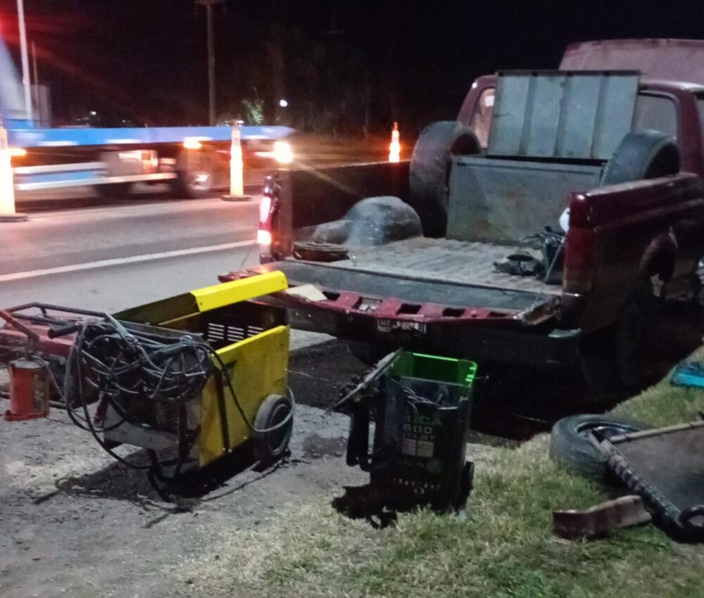 Al revisar la caja de carga de una de las camionetas, observaron dos máquinas soldadoras y, al examinarlas con mayor detenimiento, descubrieron que ocultaban en su interior numerosas cajas de teléfonos celulares, algunas aún selladas y otras abiertas. Ante la sospecha de que se tratara de mercadería ilegal, se solicitó la presencia de la División Drogas Peligrosas y la unidad K9, aunque los perros entrenados no detectaron estupefacientes.