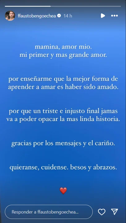 Uno de los más afectados por la partida de Alejandra fue su hijo, el actor Fausto Bengoechea, quien escribió unas dulces palabras en sus historias de Instagram para despedir a su madre.