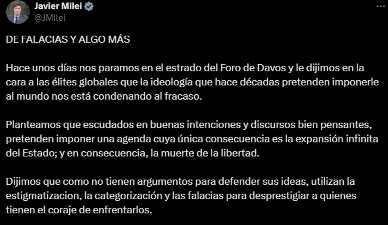 “La respuesta que tuvimos de las élites globales y locales fue tildar a Elon Musk de nazi (falacia ad hominem) y acusarnos de decir cosas que no dijimos (falacia del hombre de las paja). Desde Tenembaum a Jorge Macri, pasando por el hijo del humorista Tato Bores, que escribe en el pasquín que recibe pauta del GCBA, todos se montaron a una campaña de indignación frente a supuestas cosas que nunca dijimos, con el solo fin de hacer daño y anotarse un poroto político en la pequeña disputa electoral argentina”, indicó.