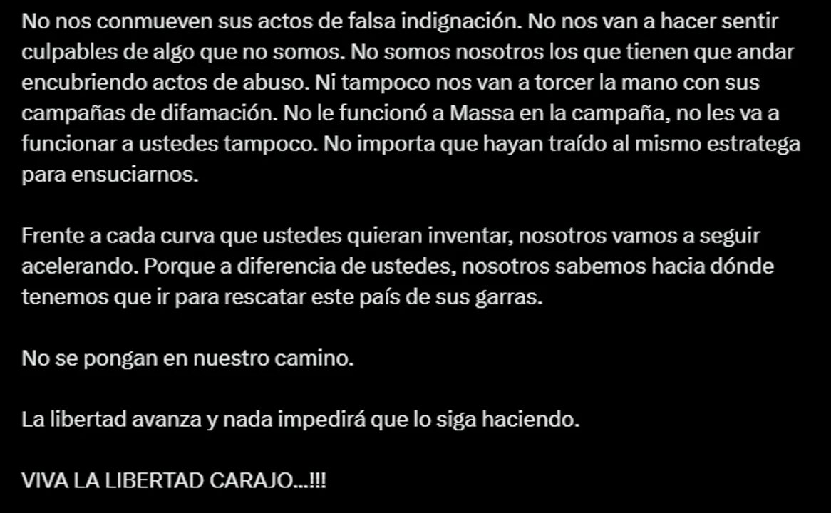 “Frente a cada curva que ustedes quieran inventar, nosotros vamos a seguir acelerando. Porque a diferencia de ustedes, nosotros sabemos hacia dónde tenemos que ir para rescatar este país de sus garras. La libertad avanza y nada impedirá que lo siga haciendo”, concluyó.