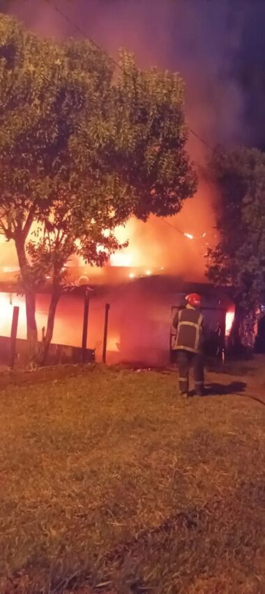 La familia logró salir de la vivienda y fue contenida por el personal policial de la Secional Primera que tomó conocimiento de la situación por un llamado al 911. Bomberos Policiales y Voluntarios trabajaron arduamente hasta sofocar el incendio que destruyó la casa de material y madera de 9×8 metros.
