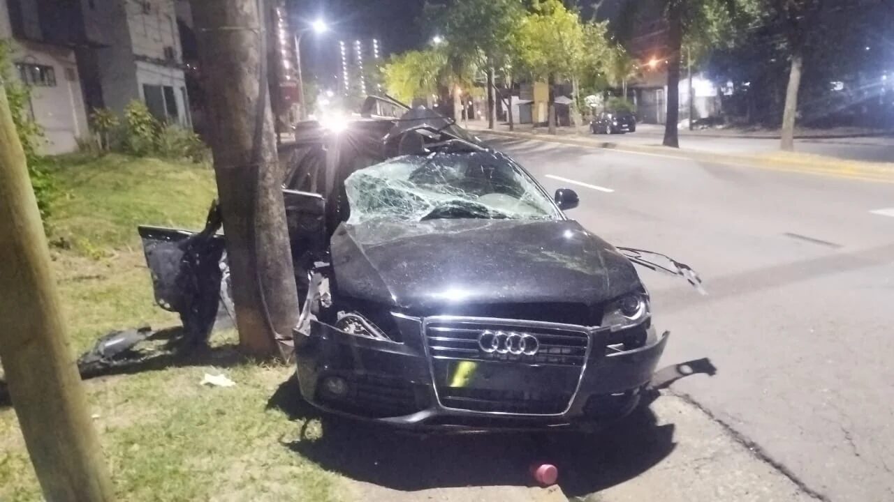 En la intersección de la avenida Urquiza y calle 65, un automóvil Audi A4 1.8 Turbo, color negro, impactó violentamente contra un poste de luz de alta tensión. Como consecuencia, sus dos ocupantes quedaron atrapados dentro del vehículo, uno de ellos falleció.