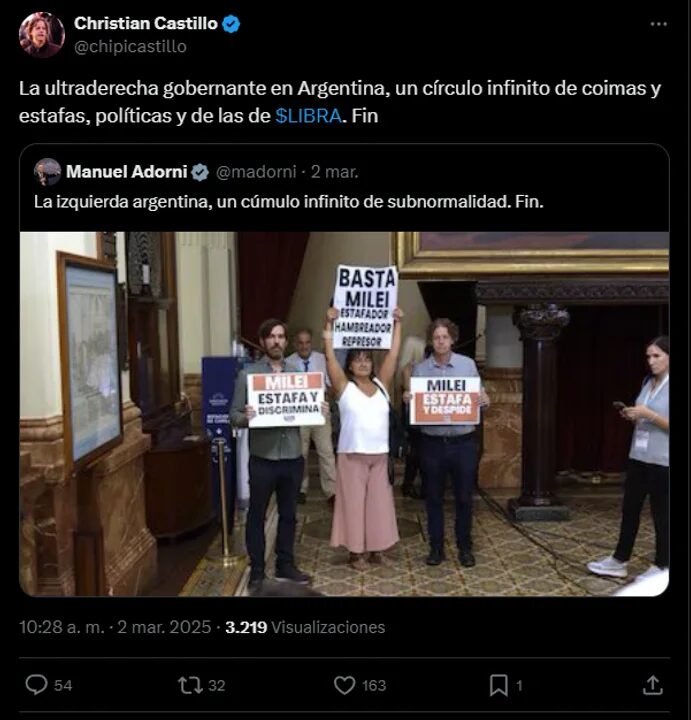 Asimismo, y al igual que sus compañeros del FIT, repudió “las agresiones físicas y amenazas” recibidas por Manes de parte de los «capu-chorros» (haciendo clara alusión al asesor presidencial Santiago Caputo).