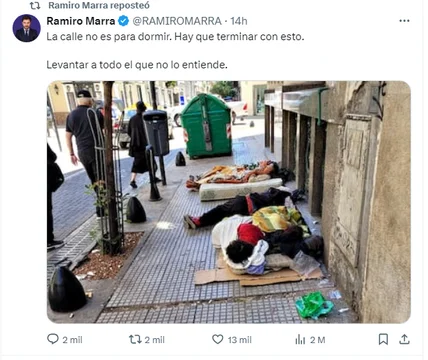 “La calle no es para dormir. Hay que terminar con esto. Levantar a todo el que no lo entiende”, expresó Marra en un posteo en X.
