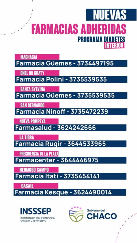 El INSSSEP incorporó 9 farmacias en el interior de la provincia, con el objetivo de fortalecer la atención de las personas con Diabetes, que se suman a la red de dispensa de medicamentos esenciales para el tratamiento de esta patología. Las localidades beneficiadas son: Machagai, Coronel Du Graty, Santa Sylvina, San Bernardo, Nueva Pompeya, La Tigra, Presidencia de la Plaza, Hermoso Campo y Basail.