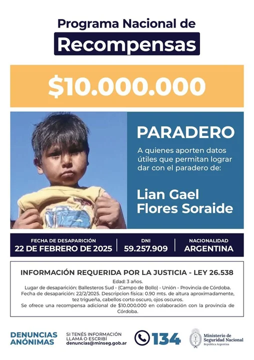 El Gobierno de Córdoba y el Ministerio de Seguridad dispusieron una recompensa de 20 millones de pesos para aquellas personas que aporten datos certeros sobre el paradero de Lian Gael Flores Sorarire, el nene de tres años que permanece desaparecido desde el sábado.