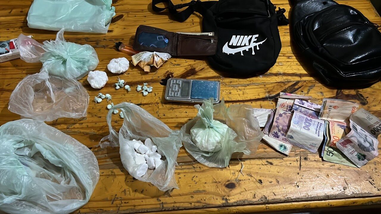 En el lugar, sobre una mesa, los policías hallaron una sustancia blanquecina en trozos compactos y pequeños envoltorios, presuntamente cocaína. Intervino la Dirección de Consumos Problemáticos, que realizó la prueba de campo y el pesaje de la sustancia, confirmando que se trataba de cocaína con un peso total de 229 gramos distribuidos en 154 envoltorios.