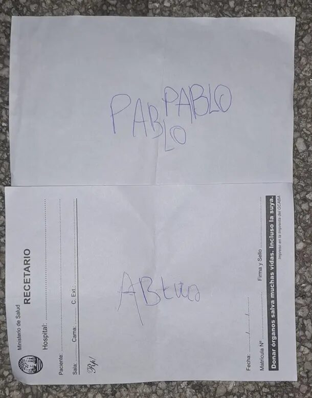 En las imágenes puede verse las palabras escritas: «Pablo» en dos oportunidades y «Abuelo» sobre papel blanco de un recetario médico.
