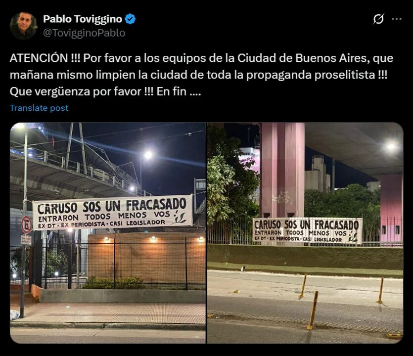 El tesorero de AFA, Pablo Toviggino, volvió a atacar a Ricardo Caruso Lombardi, habitual crítico de la gestión de Claudio Tapia. Utilizó su cuenta de la red social X (anteriormente llamada Twitter) para compartir imágenes de unos pasacalles que aparecieron en la esquina de los estudios de TN, donde trabaja el fallido candidato a legislador.