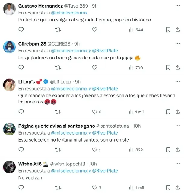 En redes sociales, los hinchas mexicanos expresaron su frustración con comentarios como “Papelón histórico”, “no traen ganas de nada”, “son un chiste” y “no vuelvan”. La mayoría de las críticas se dirigieron a la decisión del entrenador Javier Aguirre de alinear un equipo «B» para este encuentro.