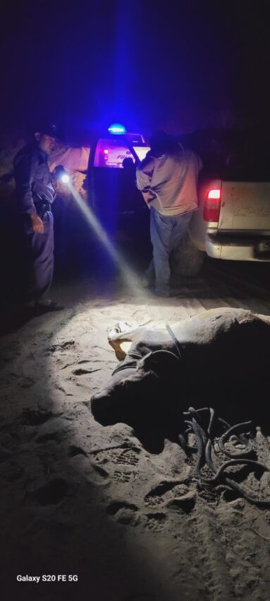 La persecución se extendió por varios kilómetros hasta que el vehículo detuvo su marcha. En ese momento, dos hombres que iban en la caja de la camioneta arrojaron a la vera del camino el cuerpo sin vida de una vaquilla con diseño de marca y señal y huyeron hacia una zona boscosa. Ambos estaban armados —uno con un arma corta y el otro con un rifle— y apuntaron a los agentes sin llegar a disparar.