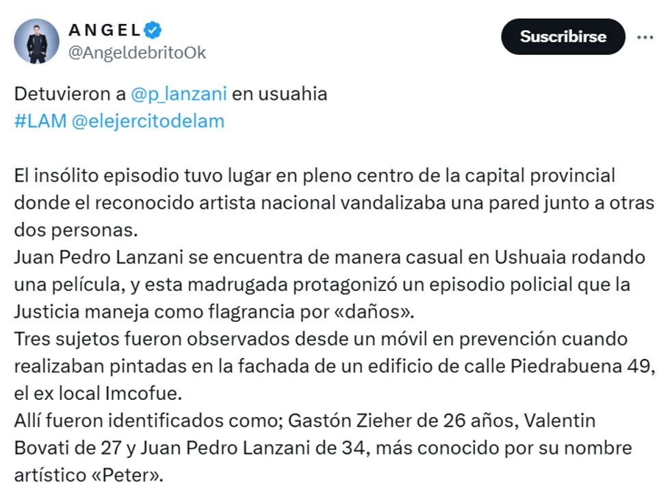 «Allí fueron identificados como; Gastón Zieher de 26 años, Valentin Bovati de 27 y Juan Pedro Lanzani de 34, más conocido por su nombre artístico ‘Peter’”, reveló el periodista.