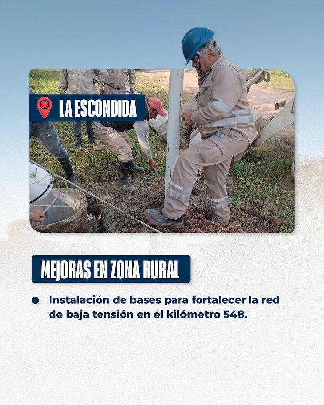 -*En La Escondida*, se instalan bases para fortalecer la red de baja tensión en el kilómetro 548, en zona rural.