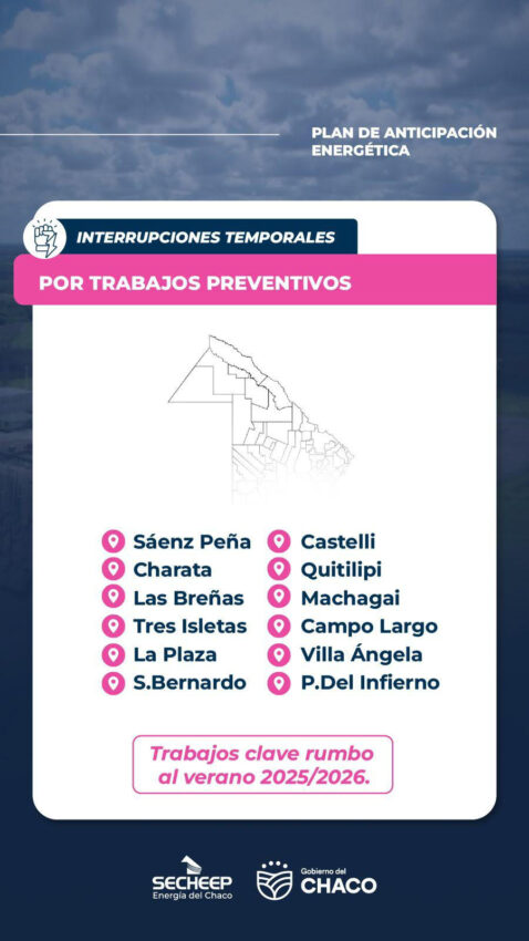 Entre el martes 10 y el jueves 12 de junio, de 8.30 a 17 hs, podrían registrarse interrupciones temporales del servicio en distintas localidades del interior provincial. Las zonas que podrían verse afectadas comprenden a importantes centros urbanos del interior como Presidencia Roque Sáenz Peña, Villa Ángela, Charata, Juan José Castelli, Quitilipi, Machagai, Las Breñas, Campo Largo, San Bernardo, Pampa del Infierno, Presidencia de la Plaza, Tres Isletas y otras localidades abastecidas por esta red troncal.