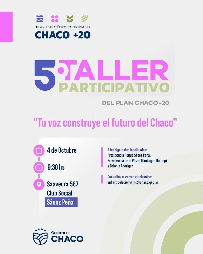 El Gobierno de la Provincia del Chaco, a través de la Secretaría de Coordinación de Gabinete, invita a representantes de instituciones intermedias, cámaras empresariales, entidades y organizaciones socioeconómicas, culturales y deportivas, entre otras, a participar en los Talleres del “Plan Estratégico Participativo Chaco+20”.