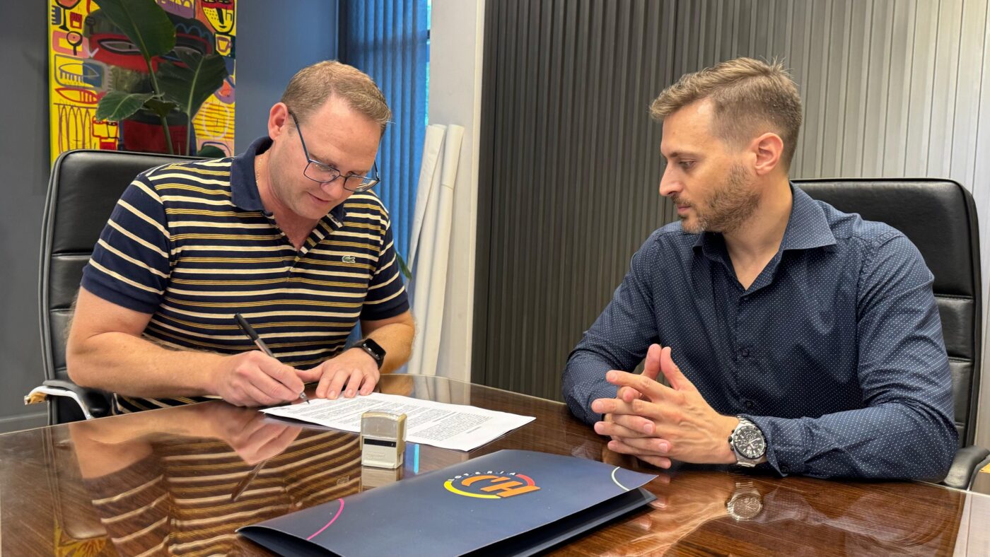El presidente de Lotería Chaqueña Lucas Apud Masín junto al titular del Club Social de Las Breñas Sebastian Pertile, acordaron una importante obra para la entidad deportiva que este año cumplió su centenario.