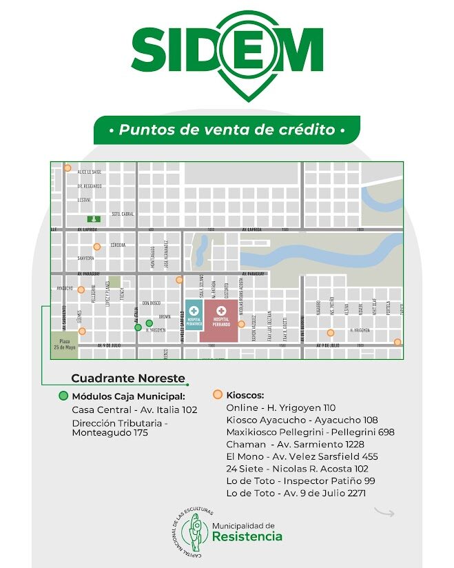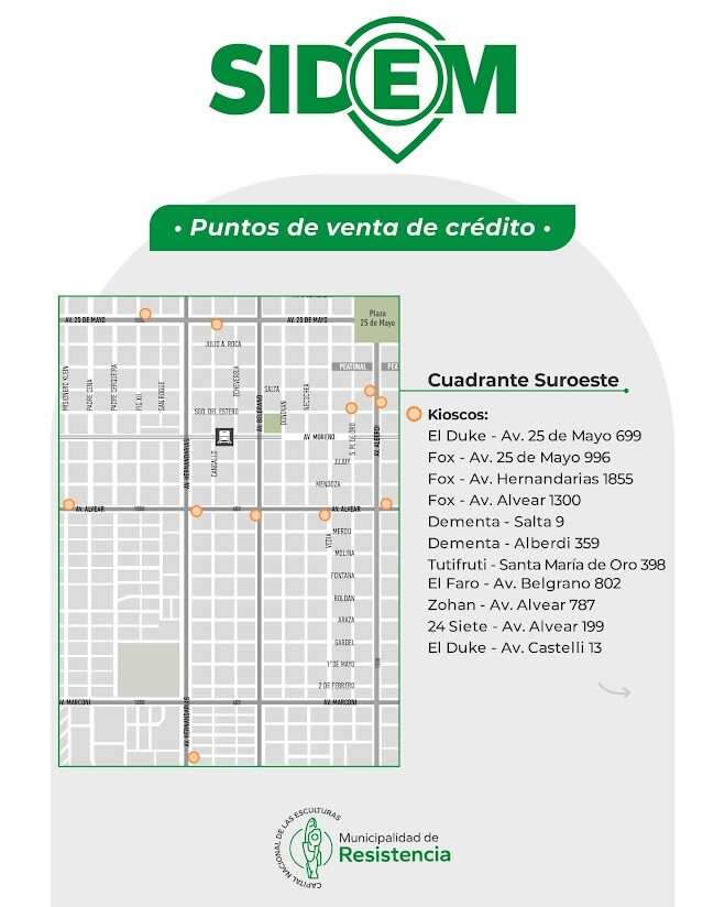La Municipalidad de Resistencia informa que dispone de un gran número de puntos de venta en diferentes zonas de la Ciudad para la carga de crédito del Sistema de Estacionamiento Medido (SIDEM), que empezó a regir el 1° de abril, en calles y avenidas del microcentro, en el horario de 8 a 12 y de 16 a 20.