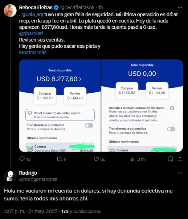 «Tuvo una gran falla de seguridad. Mi última operación en dólar mep, en la app fue en abril. La plata quedó en cuenta. Hoy de la nada aparecen 8277,60usd. Horas más tarde la cuenta pasó a 0 usd. Revisen sus cuentas. Hay gente que pudo sacar esa plata y otros que operaron. Esto es muy grave. Si la empresa no lo resuelve se procederá a la denuncia correspondiente. Imposible comunicarse con alguien a través del chat», denunció la diputada libertaria Rebeca Fleitas.
