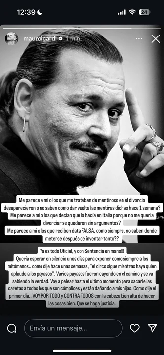 Pero este miércoles, el futbolista del Galatasaray volvió a expresarse y fue muy duro con sus mensajes. Para su primer posteo volvió a elegir una imagen del actor Johnny Depp y escribió: “¿Me parece a mí o los que me trataban de mentiroso en el divorcio desaparecieron o no saben cómo dar vuelta las mentiras dichas hace una semana? ¿Me parece a mí o los que decían que lo hacía en Italia porque no me quería divorciar se quedaron sin argumentos? ¿Me parece a mí o los que reciben data falsa, como siempre, no saben dónde meterse después de inventar tanto?”.