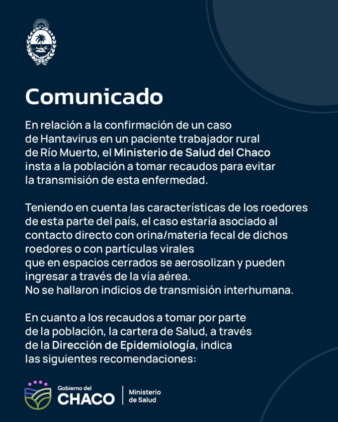 Luego de la confirmación de un caso de Hantavirus en la provincia, el Ministerio de Salud del Chaco insta a la población a seguir una serie de recomendaciones a tener en cuenta por posible presencia de roedores en domicilios o zonas cercanas.