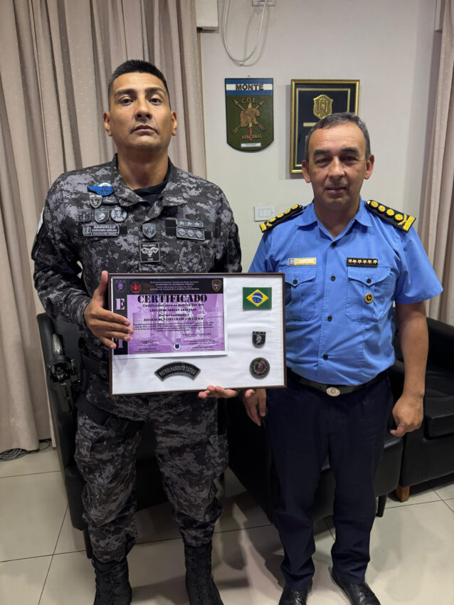 En la mañana de este lunes 26 de mayo de 2025, el Jefe de Policía de la Provincia del Chaco, Comisario General Fernando Javier Romero, recibió en su despacho al Oficial Principal de Policía Leonardo Adrián Arguello, quien recientemente participó del “X° Curso de Patrulla Táctica Motorizada (X PATAMO) del GCM de Embu das Artes” en Brasil.