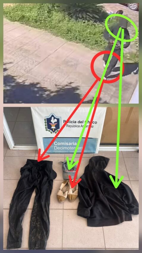 Gracias al aporte de cámaras de seguridad de una vecina, se pudo identificar al presunto autor: un hombre vestido con buzo con capucha y pantalón negros, además de una gorra. Con esos datos, personal del servicio externo y de guardia de la Comisaría 13° Metropolitana inició un rastrillaje por la zona.
