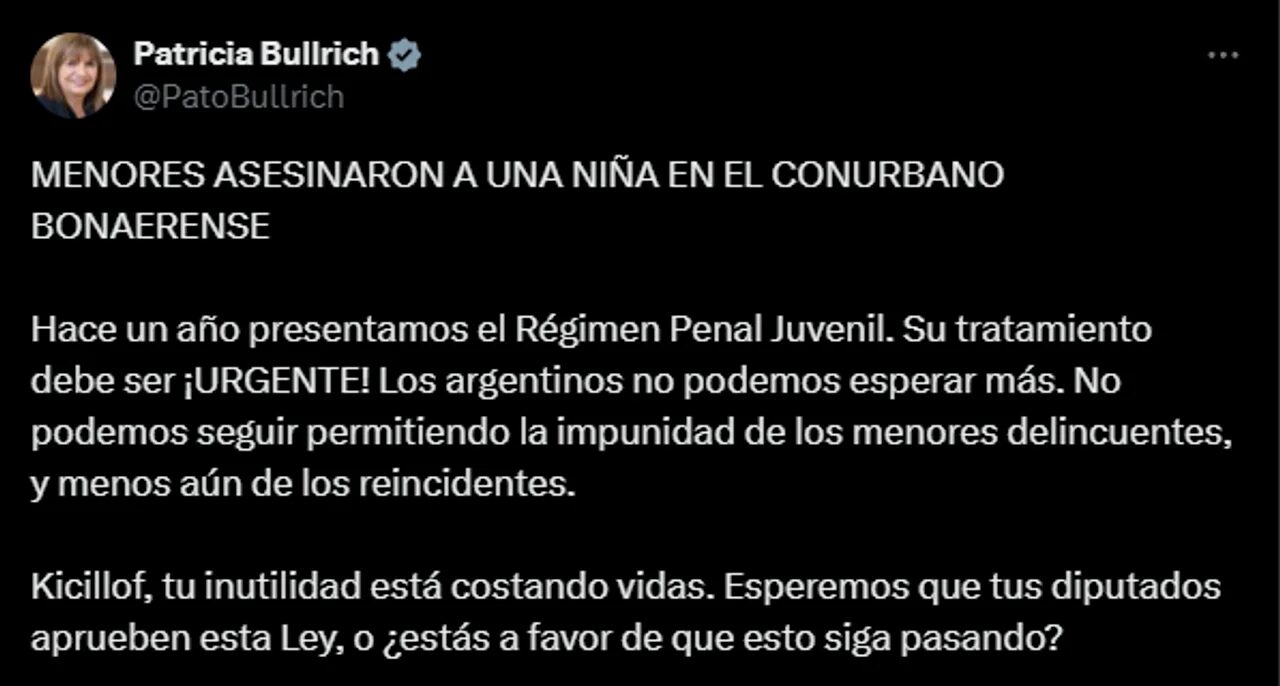 “No podemos seguir permitiendo la impunidad de los menores delincuentes, y menos aún de los reincidentes. Kicillof, tu inutilidad está costando vidas. Esperemos que tus diputados aprueben esta Ley, o ¿estás a favor de que esto siga pasando?”, argumentó.