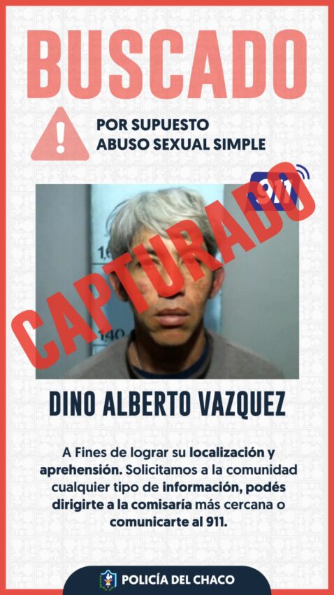 A las 9:30, personal policial que realizaba tareas investigativas localizó al presunto autor a pocos metros de su domicilio, en la calle Roque Sáenz Peña al 2700. El individuo fue identificado como Vázquez Dino Alberto, de 39 años, quien fue notificado de su situación legal y trasladado para las diligencias judiciales correspondientes.