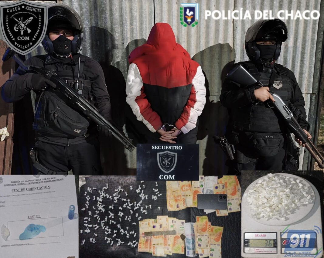 En el lugar, se procedió al secuestró de 36 gramos de cocaína fraccionada en 149 envoltorios, un teléfono celular marca Motorola gris y $55.000 pesos en efectivo.