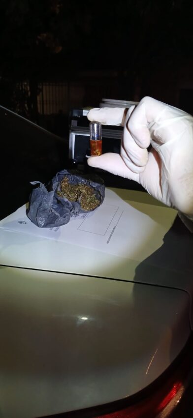 El sujeto, tenía en su poder una bolsa con una sustancia vegetal con olor característico a marihuana, además de un cuchillo. Inmediatamente solicitaron la colaboración de la División Microtráfico, quienes realizaron la prueba de campo, dando positivo para marihuana, con un pesaje total de 20 gramos.