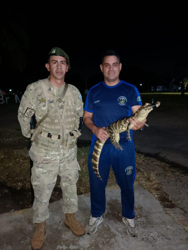 El efectivo se trasladó en la motocicleta policial MK-132 hasta el lugar, donde fue recibido por el jefe de turno del Comando de Brigada de Monte III, mayor Jorge Vélez Soler. El reptil se encontraba en el sector de ingreso a la guardia. Tras la verificación, se constató que se trataba de un yacaré overo (Caiman latirostris), hembra juvenil de aproximadamente 90 centímetros. El animal fue capturado sin inconvenientes para su posterior traslado a un centro de resguardo.
