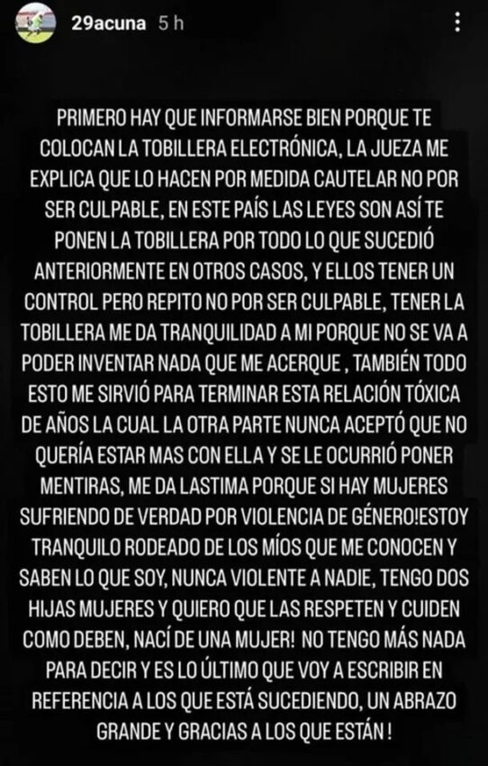 La vida del futbolista estaba marcada por un contexto complejo, ya que dos semanas antes de su fallecimiento, Acuña había sido denunciado por violencia de género por su expareja, lo que derivó en la colocación de una tobillera electrónica como medida cautelar. En redes sociales, el jugador intentó aclarar su situación, señalando que no era culpable y calificando la medida como una precaución judicial. Además, expresó su deseo de dejar atrás una relación que describió como tóxica, afirmando que nunca había ejercido violencia contra nadie.