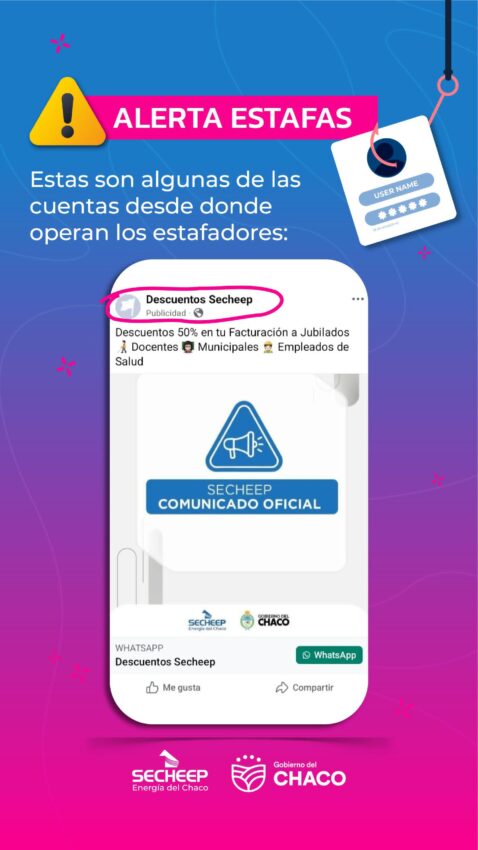 Secheep advierte y reitera a la comunidad, estar alertas ante nuevos intentos de estafas a través de cuentas falsas de Facebook, llamadas telefónicas y/o de WhatsApp que utilizan el nombre de la empresa energética.
