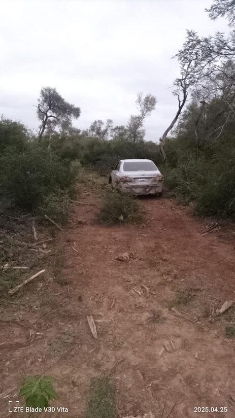 Tras una intensa persecución y posterior rastrillaje en una zona de monte —caracterizada por senderos utilizados para la extracción de madera—, se logró hallar un automóvil Toyota Corolla, color gris, dominio MER-248, abandonado y cargado con unas 50 cubiertas de distintas medidas.