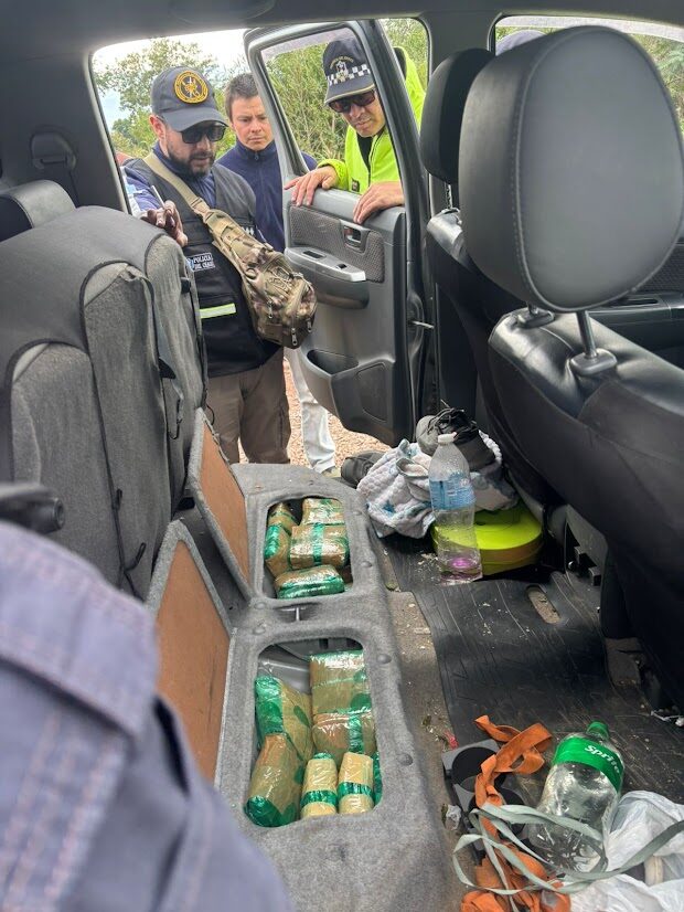 Ante la actitud sospechosa de los ocupantes, se solicitó la presencia del personal especializado de la División Microtráfico Metropolitana, quienes acudieron con el can antinarcóticos “Lulú”, guiado por el sargento Daniel Amarilla. El animal marcó interés en la parte trasera del vehículo, donde tras una revisión manual se encontraron 20 formatos cuadrados envueltos en polietileno verde y cinta de embalar marrón, con un peso total de 5.059 gramos de hojas de coca.