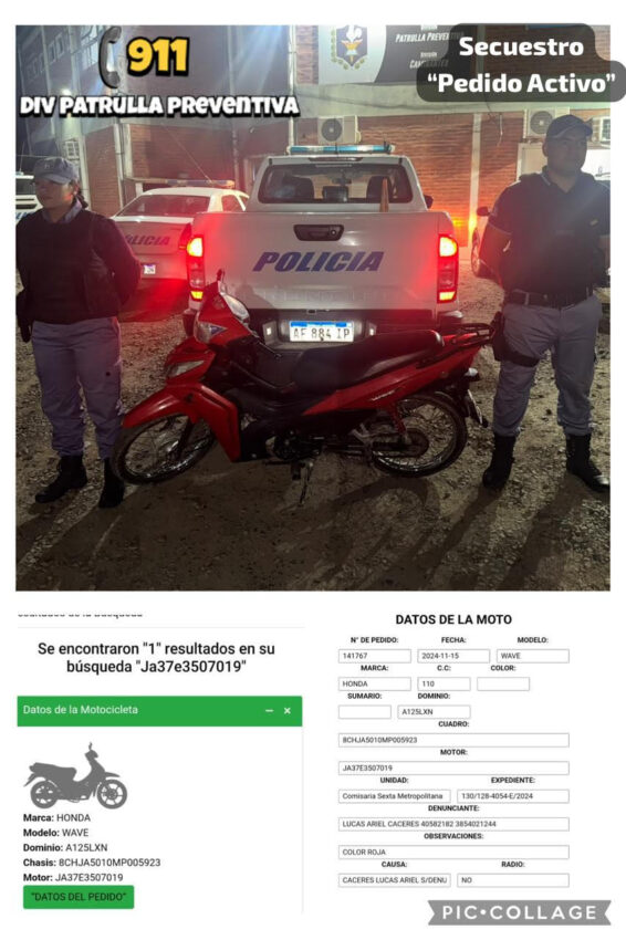 Se trata de una motocicleta marca Honda, modelo Wave 110 cc, color rojo, con dominio A125LXN, en estado de uso regular. Los efectivos constataron, mediante el Padrón Motovehicular Unificado (PMU) provisto por el Departamento de Investigaciones Complejas, que el rodado contaba con pedido de secuestro activo N° 141767, de fecha 15 de noviembre de 2024, en el marco de la causa “C. L. A. S/Denuncia”, a solicitud de la Comisaría Sexta de Resistencia.