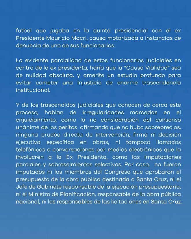 La evidente parcialidad de estos funcionarios judiciales en contra de la ex presidenta, haría que la “Causa Vialidad” sea de nulidad absoluta, y amerite un estudio profundo para evitar cometer una injusticia de enorme trascendencia institucional. Y de los trascendidos judiciales que conocen de cerca este proceso, hablan de irregularidades marcadas en el enjuiciamiento, como la no consideración del consenso unánime de los peritos afirmando que no hubo sobreprecios, ninguna prueba directa de intervención, firma ni decisión ejecutiva específica en obras, ni tampoco llamados telefónicos o conversaciones por medios electrónicos que la involucren a la Ex Presidenta, como las imputaciones parciales y sobreseimientos selectivos. Por caso, no fueron imputados ni los miembros del Congreso que aprobaron el presupuesto de la obra pública destinada a Santa Cruz, ni el Jefe de Gabinete responsable de la ejecución presupuestaria, ni el Ministro de Planificación, responsable de la obra pública nacional, ni los responsables de las licitaciones en Santa Cruz.