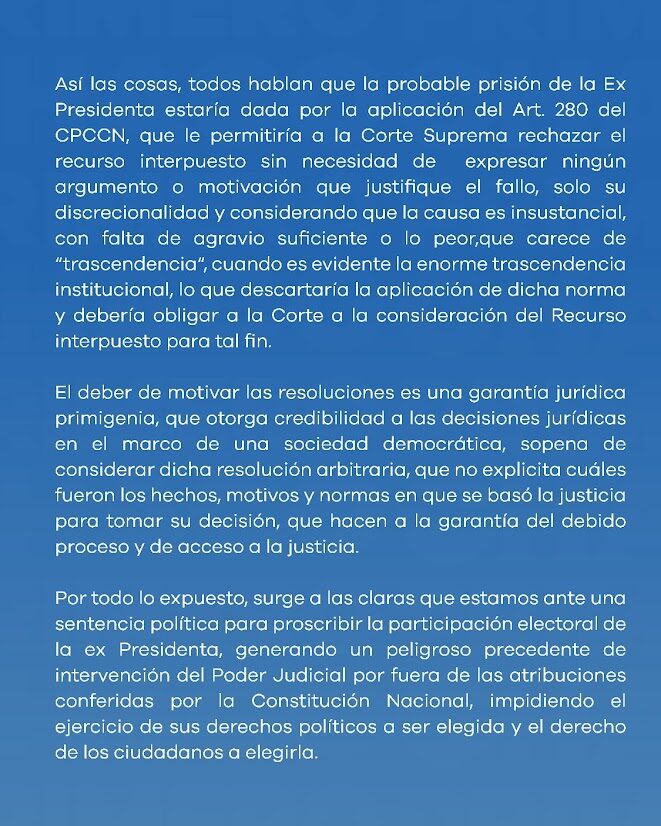 Así las cosas, todos hablan que la probable prisión de la Ex Presidenta estaría dada por la aplicación del Art. 280 del CPCCN, que le permitiría a la Corte Suprema rechazar el recurso interpuesto sin necesidad de expresar ningún argumento o motivación que justifique el fallo, solo su discrecionalidad y considerando que la causa es insustancial, con falta de agravio suficiente o lo peor,que carece de “trascendencia “, cuando es evidente la enorme trascendencia institucional, lo que descartaría la aplicación de dicha norma y debería obligar a la Corte a la consideración del Recurso interpuesto para tal fin.