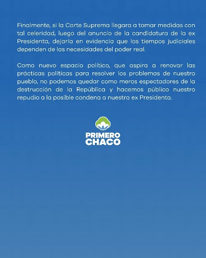 Como nuevo espacio político, que aspira a renovar las prácticas políticas para resolver los problemas de nuestro pueblo, no podemos quedar como meros espectadores de la destrucción de la República y hacemos público nuestro repudio a la posible condena a nuestra ex Presidenta.
