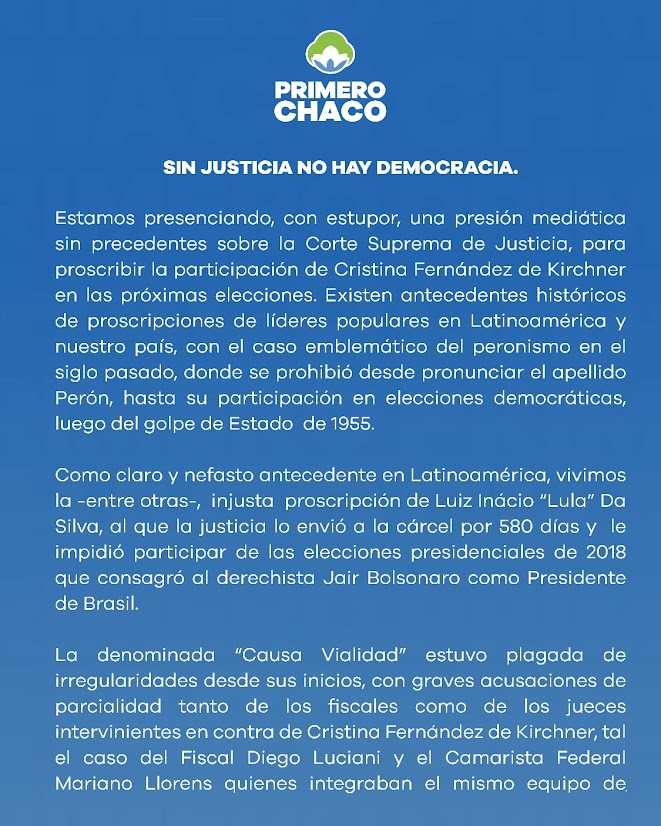 Como nuevo espacio político, que aspira a renovar las prácticas políticas para resolver los problemas de nuestro pueblo, no podemos quedar como meros espectadores de la destrucción de la República y hacemos público nuestro repudio a la posible condena a nuestra ex Presidenta.