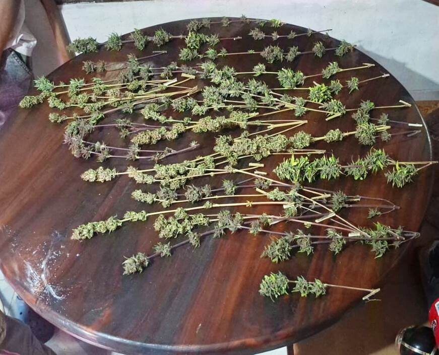 Encontraron plantas, cogollos, frascos con sustancia vegetal disgregada y otros elementos que evidencian la venta de estupefacientes a baja escala. Se contabilizó en total 204 gramos de marihuana entre cogollos y sustancia disgregada.