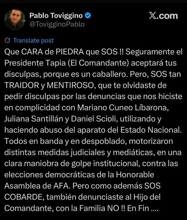 El tesorero de la Asociación del Fútbol Argentino (AFA) y dirigente cercano a Tapia, Pablo Toviggino, rechazó con dureza las declaraciones del dirigente cordobés y lo calificó de “cara de piedra”, “traidor”, “mentiroso” y “cobarde”.