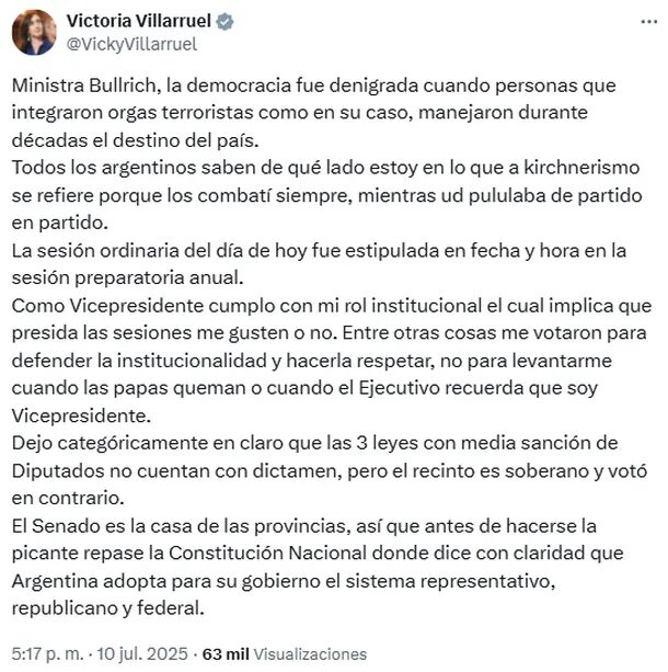 La vice dejó «categóricamente en claro que las 3 leyes con media sanción de Diputados no cuentan con dictamen, pero el recinto es soberano y votó en contrario», y concluyó: «El Senado es la casa de las provincias, así que antes de hacerse la picante repase la Constitución Nacional donde dice con claridad que Argentina adopta para su gobierno el sistema representativo, republicano y federal».
