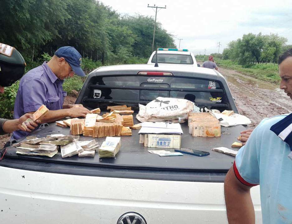 En la camioneta y en la bolsa que llevaba se hallaron tres bultos con una suma total de $15.289.000, un revólver calibre 22, un celular, documentación a su nombre y varios objetos personales. La camioneta, consultada en el Sistema Federal de Comunicaciones Policiales SIFCOP, presentaba pedido de secuestro por hurto agravado, con intervención del Departamento Judicial de San Martín (Buenos Aires).