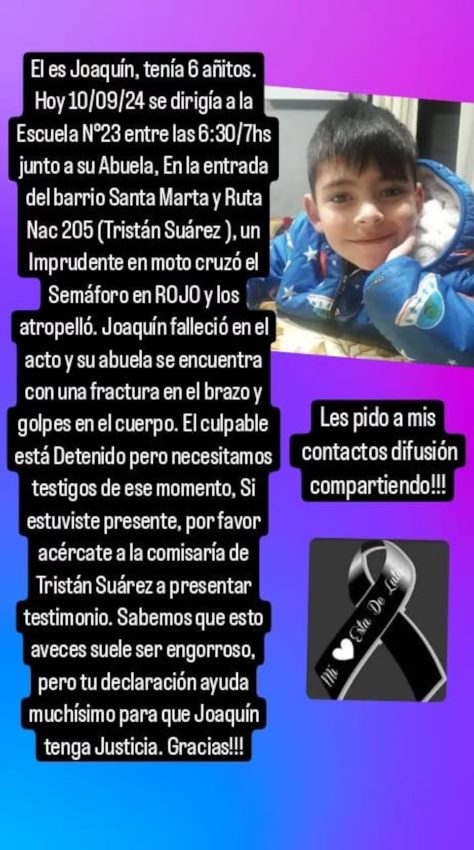 Pese a que el responsable fue detenido, la mamá de la víctima solicitó que aquellos que quieran colaborar en el esclarecimiento de la causa se acerquen hasta la comisaría segunda de Tristán Suárez, ubicada en Erratchu y Maroto, para “ayudar a que Joaquín tenga justicia”.