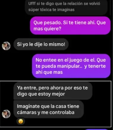 «Uff si te digo, la relación se volvió súper tóxica en todos los sentidos. Imaginate que la casa estaba llena de cámaras y me controlaba», contaba Camila. La relación llegó a tal punto que tuvo que sacar casi todas sus fotos de sus redes sociales, debido a fuertes manifestaciones de celos del médico quien le recriminaba permanentemente por eso. «Yo ya entendí, no le sigo el juego de continuar con la discusión, no le doy bola», puntualizaba.