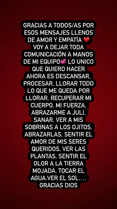 “Gracias a todos/as por esos mensajes llenos de amor y empatía. Voy a dejar toda comunicación a manos de mi equipo. Lo único que quiero hacer ahora es descansar, procesar, llorar todo lo que me queda por llorar, recuperar mi cuerpo, mi fuerza. abrazarme a Juli -Reininger-, sanar, ver a mis sobrinas a los ojitos, abrazarlas, sentir el amor de mis seres queridos, ver las plantas, sentir el olor a la tierra mojada, tocar el agua y ver el sol”, concluyó Becerra.