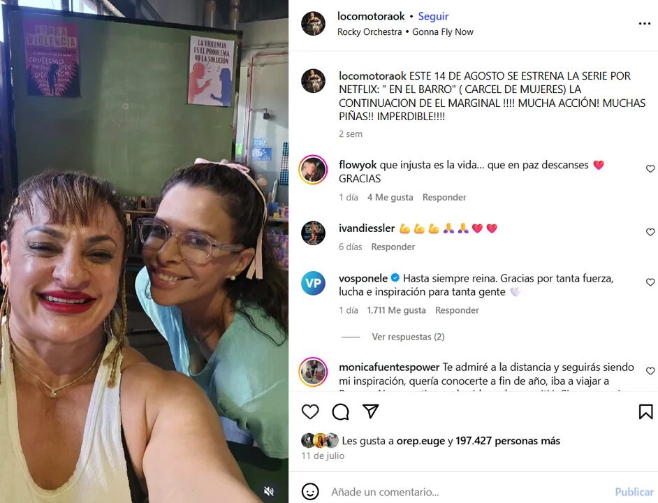 De hecho, su última publicación en Instagram fue anunciando su participación en la serie de Sebastián Ortega, junto a imágenes con las demás actrices en el set: “Este 14 de agosto se estrena la serie por Netflix: ‘En el barro’ (cárcel de mujeres), la continuación de El Marginal!! Mucha acción! Muchas piñas!! Imperdible!!!!”.